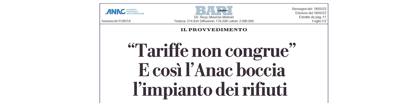 La Repubblica, edizione di Bari, dedica un ampio approfondimento alla delibera di Anac n.67 dell’8 febbraio scorso. Si parla del progetto di impianto di rifiuti di Andria, in Puglia, stoppato per illegittimità e irregolarità.