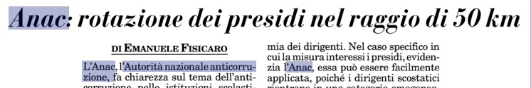 Articolo di Italia Oggi sui chiarimenti forniti dall'Anac in tema di anticorruzione nelle istituzioni scolastiche. Pur considerandole a ridotto rischio corruttivo, l'Autorità precisa che nei confronti dei dirigenti scolastici trova applicazione la misura preventiva della rotazione sulle sedi indicando come ambito territoriale dei trasferimenti un raggio di 50 chilometri rispetto alla sede di provenienza.