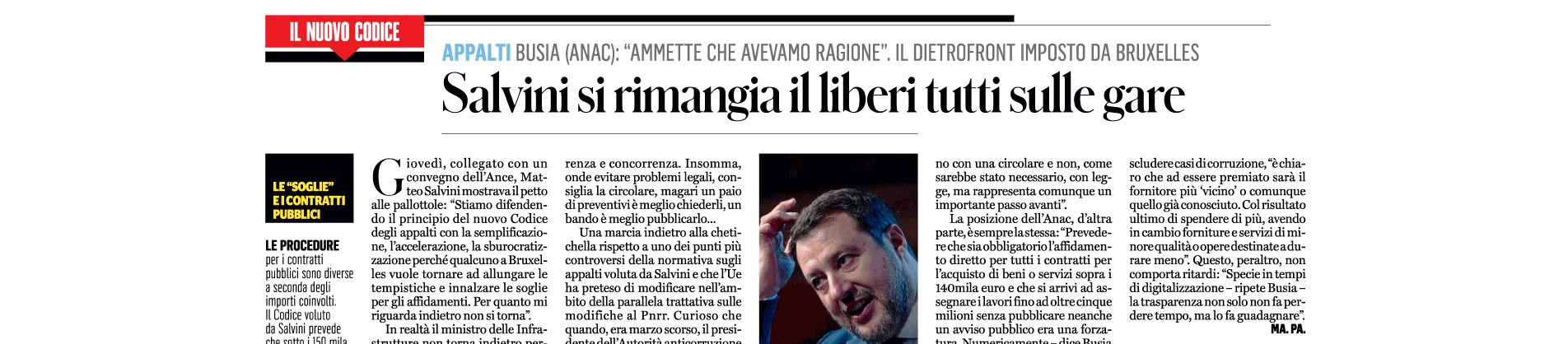 Il Fatto Quotidiano dedica un articolo alla circolare del ministro Salvini che deroga al nuovo Codice degli Appalti, indicando che va “applicato nel solco della normativa di settore della Ue”, riconoscendo ad Anac di averlo sempre detto e richiesto.