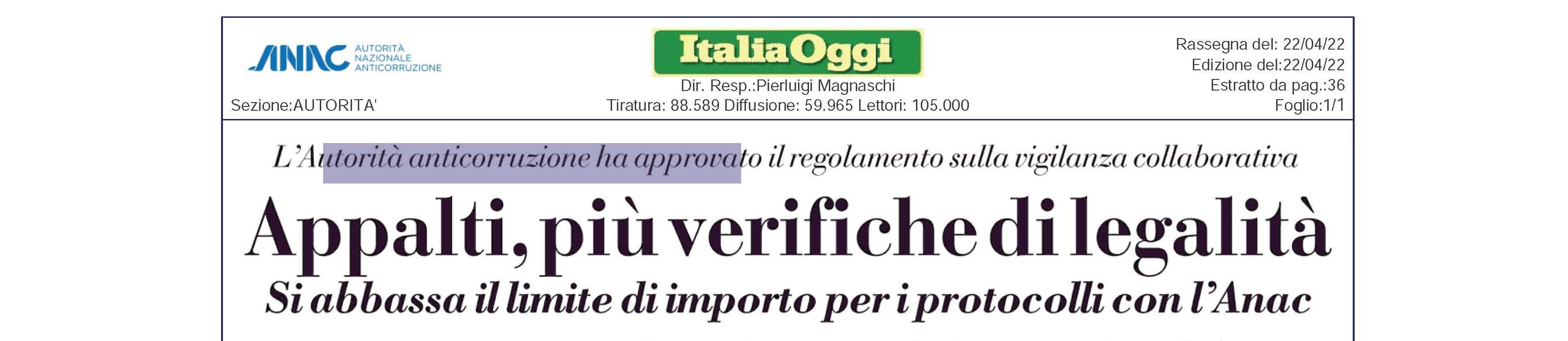Articolo di Italia Oggi sulla delibera n. 160 del 30 marzo 2022 con cui l'Anac ha approvato un nuovo Regolamento sulla vigilanza collaborativa: vengono ampliate le possibilità per le stazioni appaltanti di ricorso a tale importante strumento di collaborazione preventiva con l’Autorità Anticorruzione per indire gare, appalti e procedere con lavori e forniture anche con soglie di minore entità.