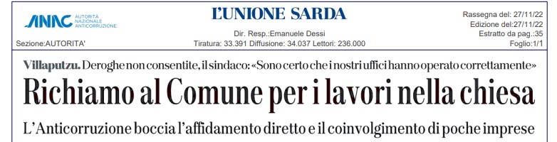 A Villaputzu i lavori di recupero della chiesa parrocchiale di San Giorgio (importo 700mila euro) avrebbero violato il codice appalti. Articolo dell'Unione Sarda sulla nota del presidente Anac Giuseppe Busia di richiamo al comune cagliaritano che ha affidato in maniera diretta i servizi di ingegneria per un importo superiore al limite previsto. Inoltre nella procedura negoziata per l'affidamento dei lavori sono state invitate cinque imprese e non dieci come previsto dalla normativa vigente.