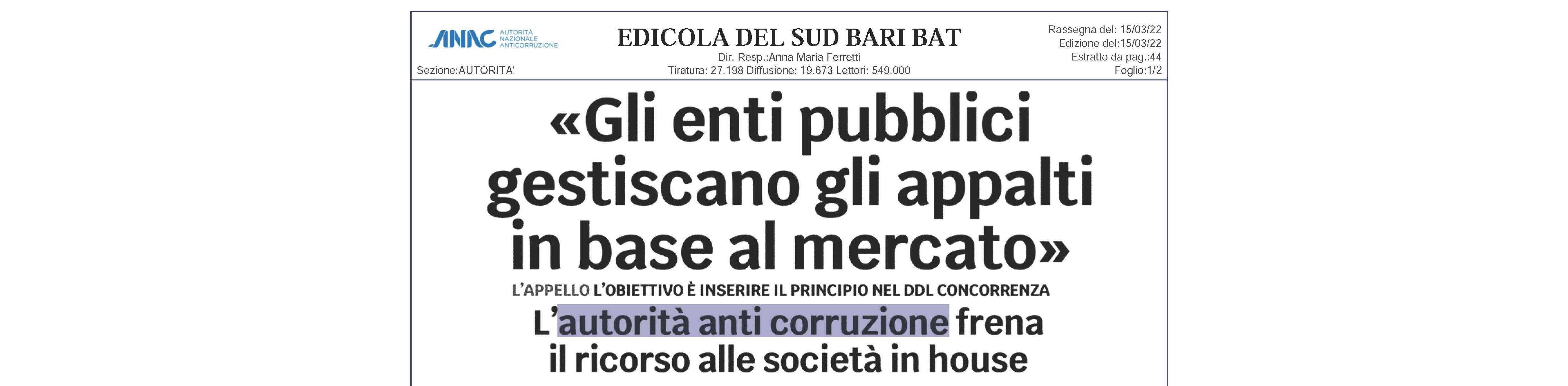Il quotidiano pugliese Edicola del Sud dedica un ampio approfondimento all’intervento del Presidente Anac, Giuseppe Busia, sul Ddl Concorrenza in discussione in Senato. "Gli enti pubblici gestiscano gli appalti in base al mercato".