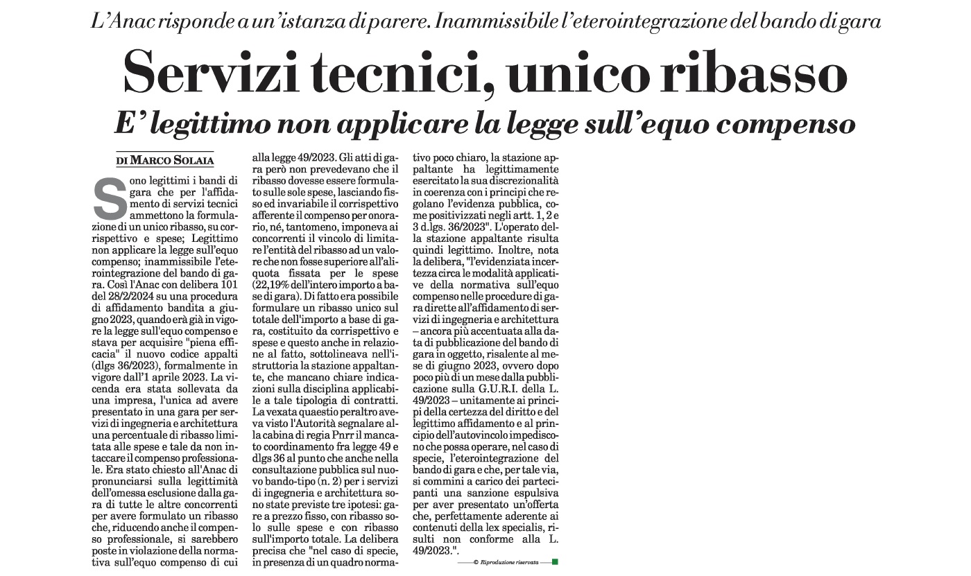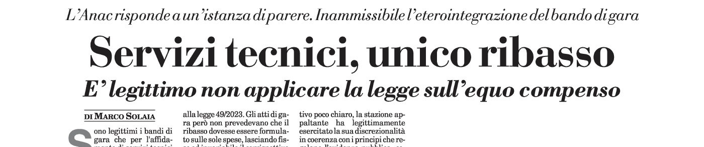 Il quotidiano economico ‘Italia Oggi’ dedica un’apertura di pagina al parere di precontenzioso di Anac che riguarda servizi tecnici ed equo compenso.