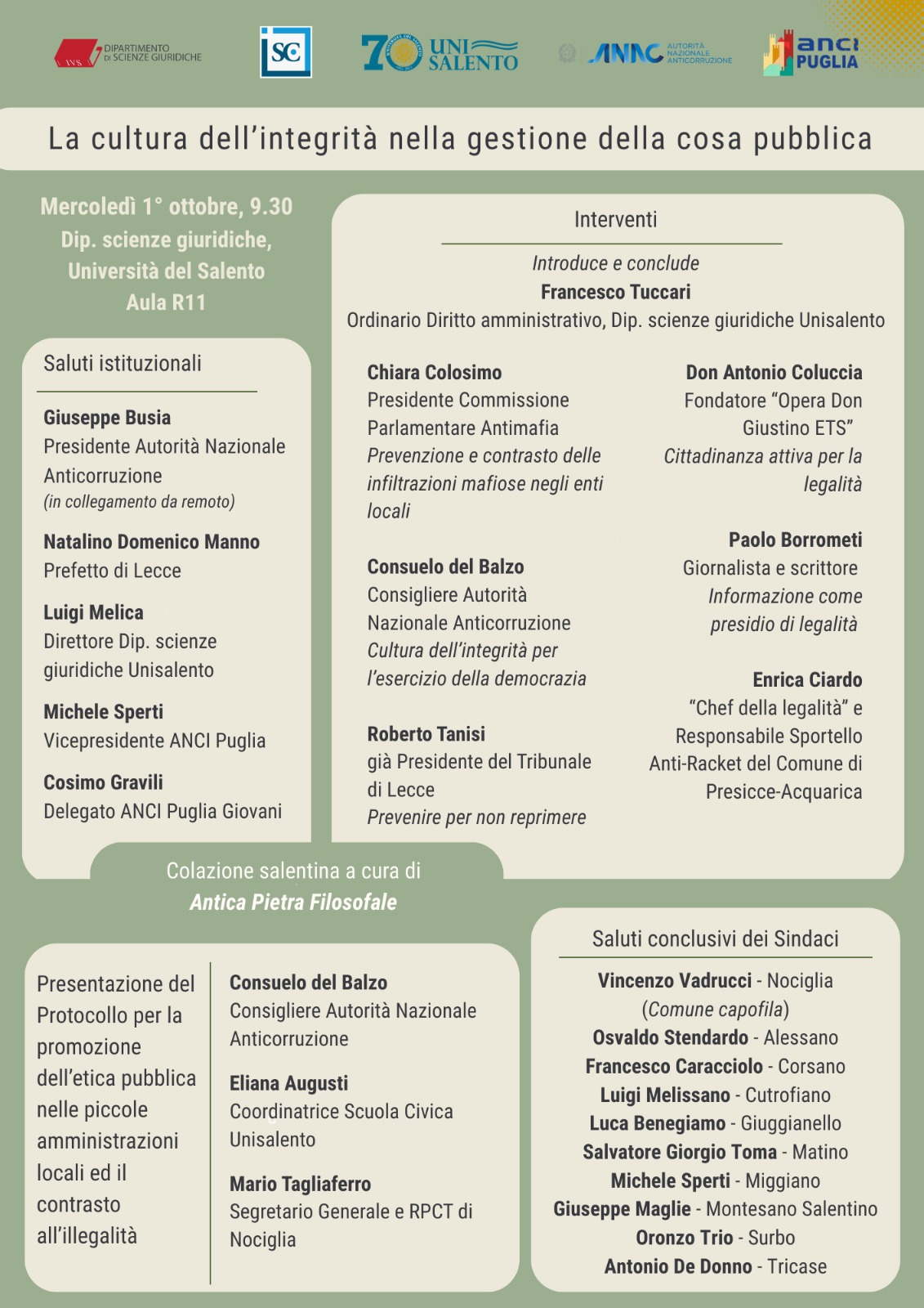 È in programma mercoledì 1° ottobre 2025 a Lecce, nella sede del Dipartimento di scienze giuridiche dell'Università del Salento (Campus Ecotekne, R11), dalle ore 9.30, l'incontro “La cultura dell’integrità nella gestione della cosa pubblica".