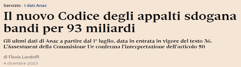 Focus del Sole 24 Ore sugli appalti in Italia dal 1° luglio 2023, data di applicazione del nuovo Codice Appalti, e sulla circolare del ministero delle Infrastrutture, giudicata dal presidente di Anac Giuseppe Busìa “una evidente marcia indietro del Governo che mostra come le nostre obiezioni erano fondate”.