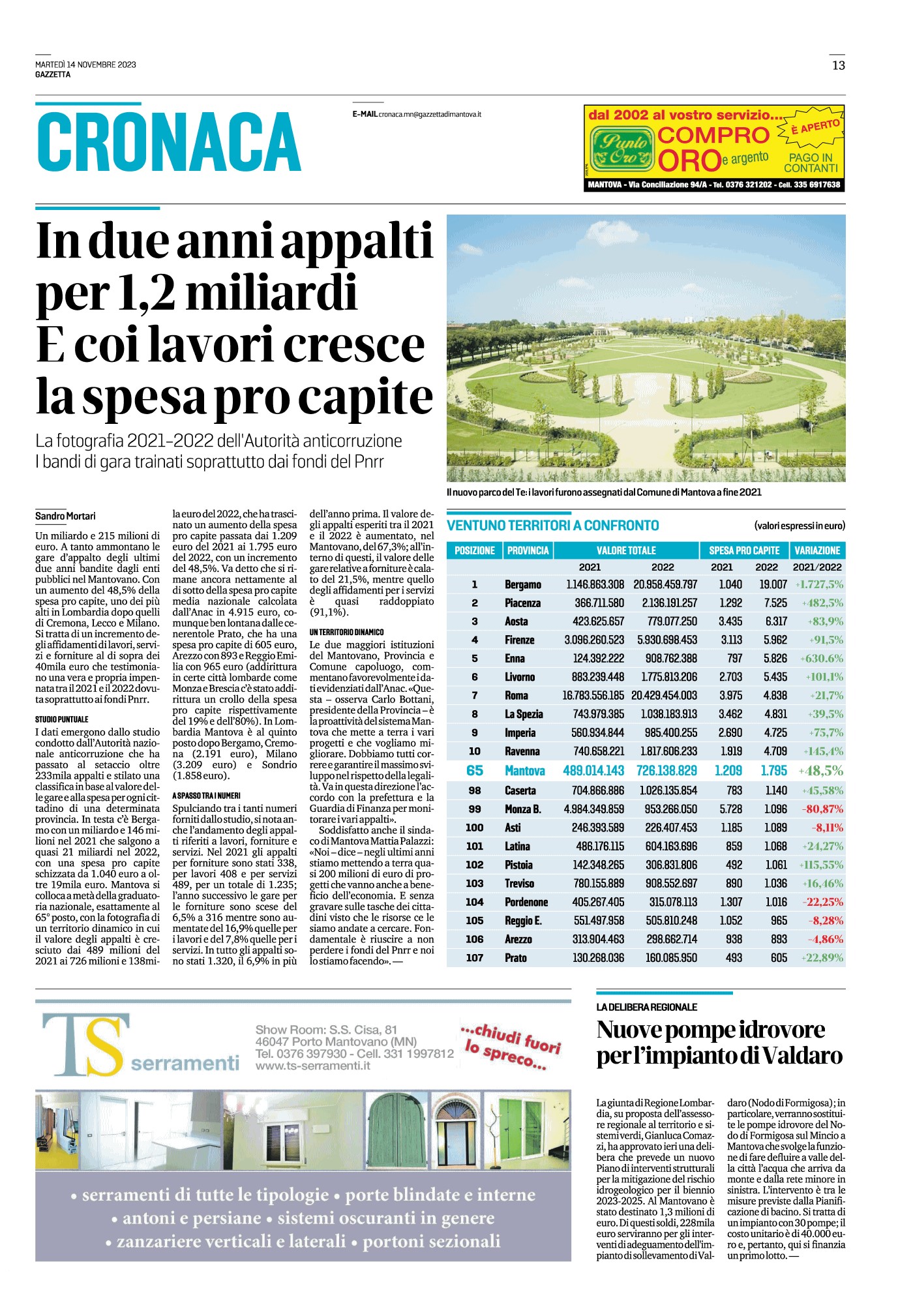 Dettagliato servizio del quotidiano La Gazzetta di Mantova sul report Anac degli appalti 2022 suddivisi per le province italiane