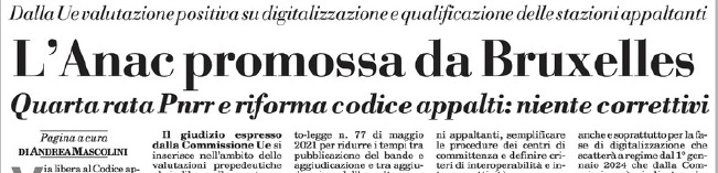 Italia Oggi dedica un approfondito focus alle valutazioni della commissione Ue sul nuovo Codice Appalti. Riportato il grande apprezzamento per Anac e il suo ruolo nella digitalizzazione degli appalti e qualificazione delle stazioni appaltanti.