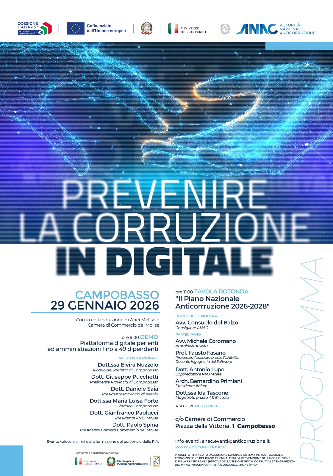 La partecipazione all'evento – organizzato in collaborazione con la Camera di Commercio del Molise e con Anci Molise – è gratuita e valevole ai fini della formazione del personale delle Pubbliche Amministrazioni. È necessario registrarsi al seguente link, con la possibilità di optare per la partecipazione in presenza o in modalità webinar: Prevenire la corruzione in digitale - Campobasso, 29 gennaio 2026