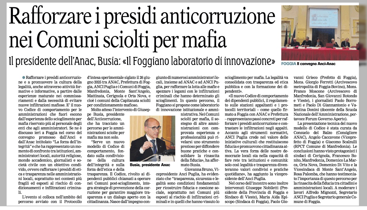Rafforzare i presidi anticorruzione nei Comuni sciolti per mafia. Il presidente dell'Anac, Busia: "Il Foggiano laboratorio di innovazione" - La Gazzetta del Mezzogiorno - 1 ottobre 2025