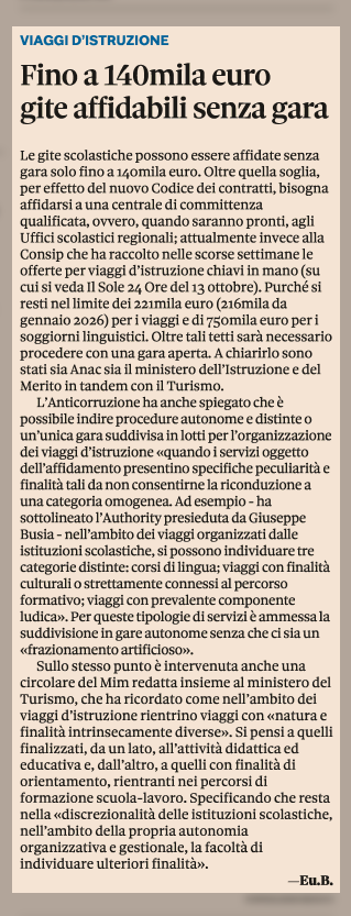 Viaggi di istruzione. Fino a 140mila euro gite affidabili senza gara - Il Sole 24 Ore - 17 novembre 2025