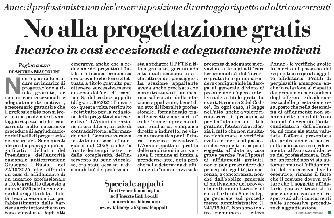 No alla progettazione gratis. Anac, il professionista non deve essere in vantaggio sugli atri concorrenti - Italia Oggi 14 novembre 2025