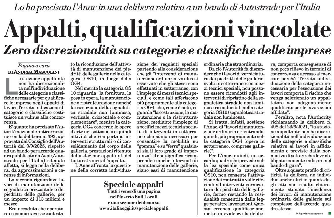 Appalti, qualificazioni vincolate - Italia Oggi 31 ottobre 2025