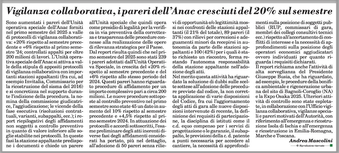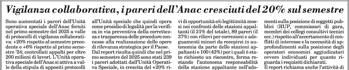 Vigilanza collaborativa, i pareri dell'Anac cresciuti del 20% sul semestre - Italia Oggi - 27 settembre 2025