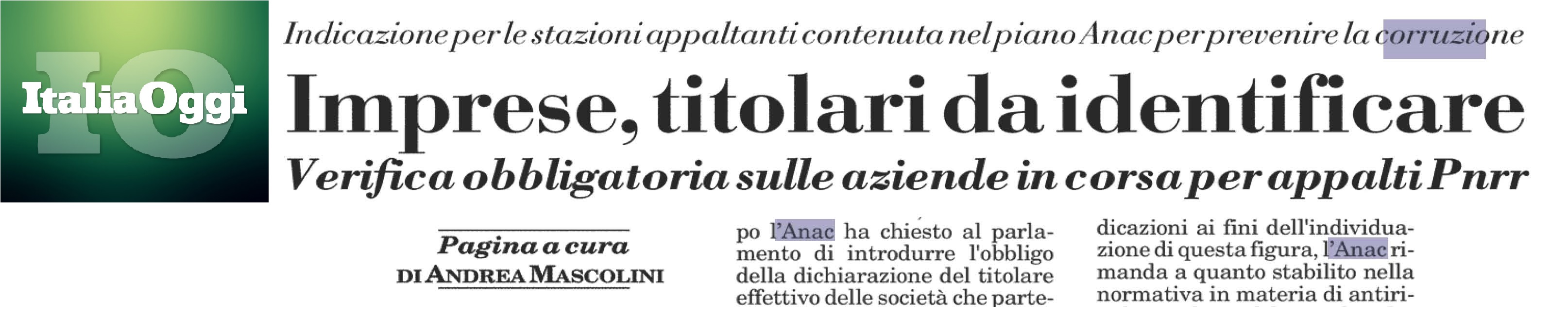 Nella pagina di Italia Oggi del 16 dicembre 2022 a cura di Andrea Mascolini, le indicazioni per le stazioni appaltanti contenute nel Piano Nazionale Anticorruzione 2022 dell'Anac in merito all'identificazione del titolare effettivo dell'impresa che concorre alle procedure di affidamento di appalti e concessioni.